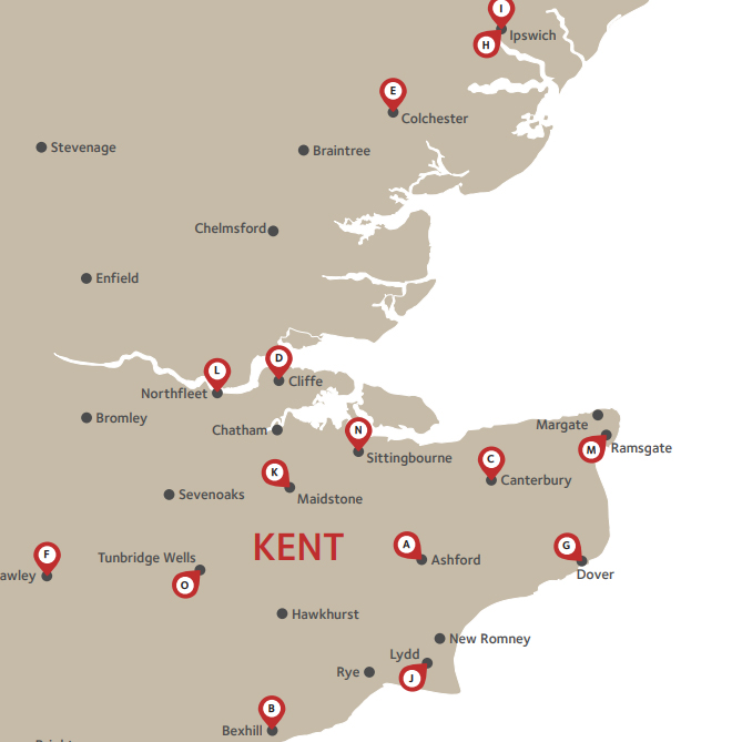 Kent - Ashford, Canterbury, Cliffe, Dover, Lydd, Maidstone, Northfleet, Sittingbourne & Sheppey, Tunbridge Wells and Ramsgate, Essex - Colchester and Suffolk - Ipswich